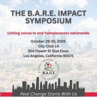 B.A.R.E. Inc. is proud to host the inaugural B.A.R.E. Impact Symposium, a national gathering of leaders, advocates, and innovators united by one mission: to end homelessness and build pathways to stability.